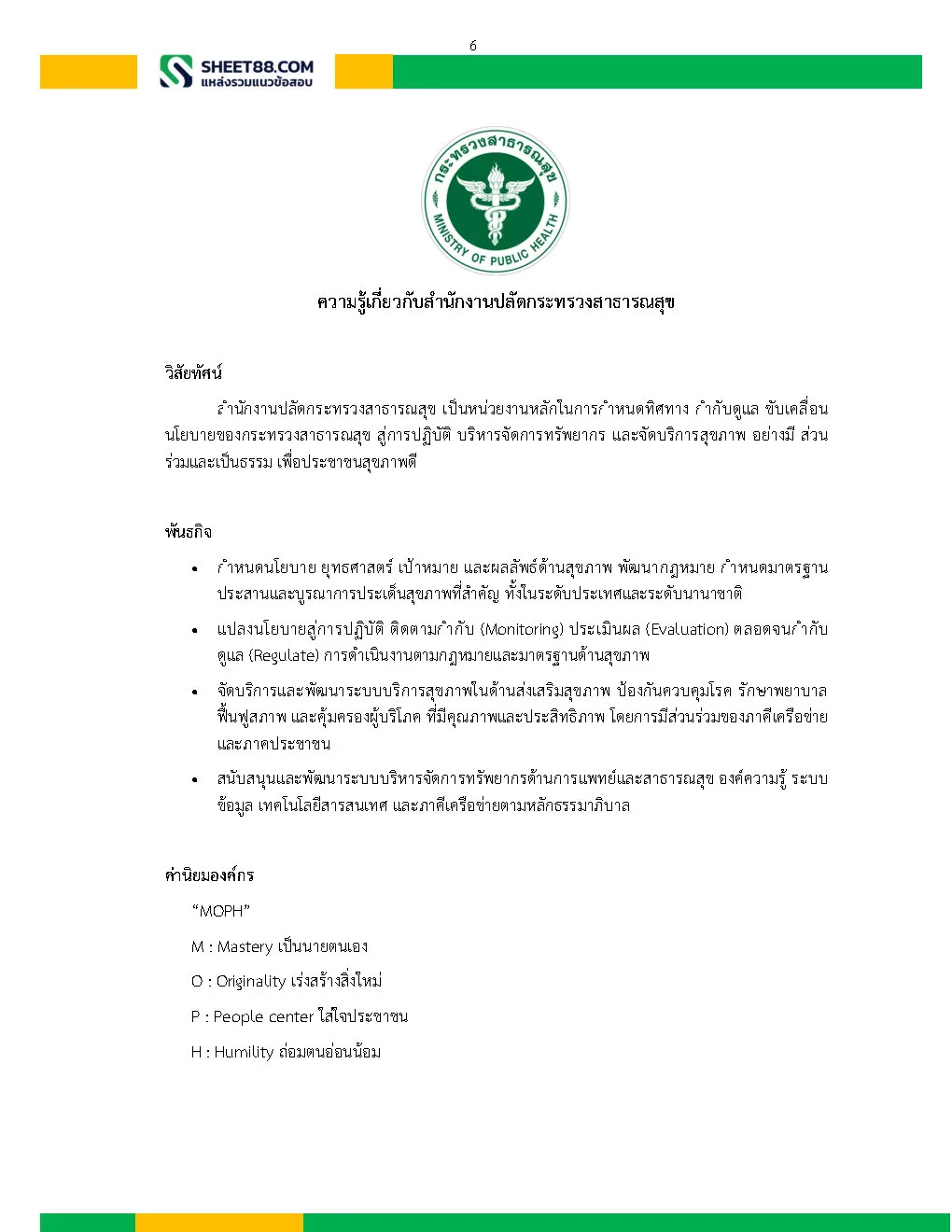 – ความรู้เกี่ยวกับวิสัยทัศน์ พันธกิจ โครงสร้าง อำนาจหน้าที่ ภารกิจ นโยบายและยุทธศาสตร์ของสำนักงานปลัดกระทรวงสาธารณสุข และกระทรวงสาธารณสุข